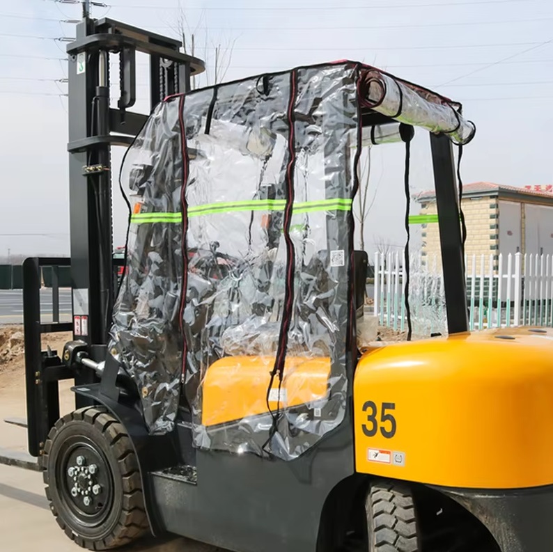 Тент - чехол предназначен для защиты оператора погрузчика от воздействия внешней окружающей среды, от ветра, осадков и насекомых. Благодаря своей высокой плотности она максимально устойчива к разрывам и разнообразному механическому воздействию. Помимо этого данный материал не теряет параметров при перепаде температуры, не разрушается под воздействием ультрафиолетовых излучений, не пропускает воду, что особенно важно в процессе использования под открытым небом. Работать с такой мягкой кабиной намного комфортнее, чем без. Поддерживать в чистоте подобный материал также весьма просто, делать это возможно бытовыми средствами. Установить универсальную кабину - тент из ПВХ на погрузчик просто и легко, это может сделать сам оператор автопогрузчика.