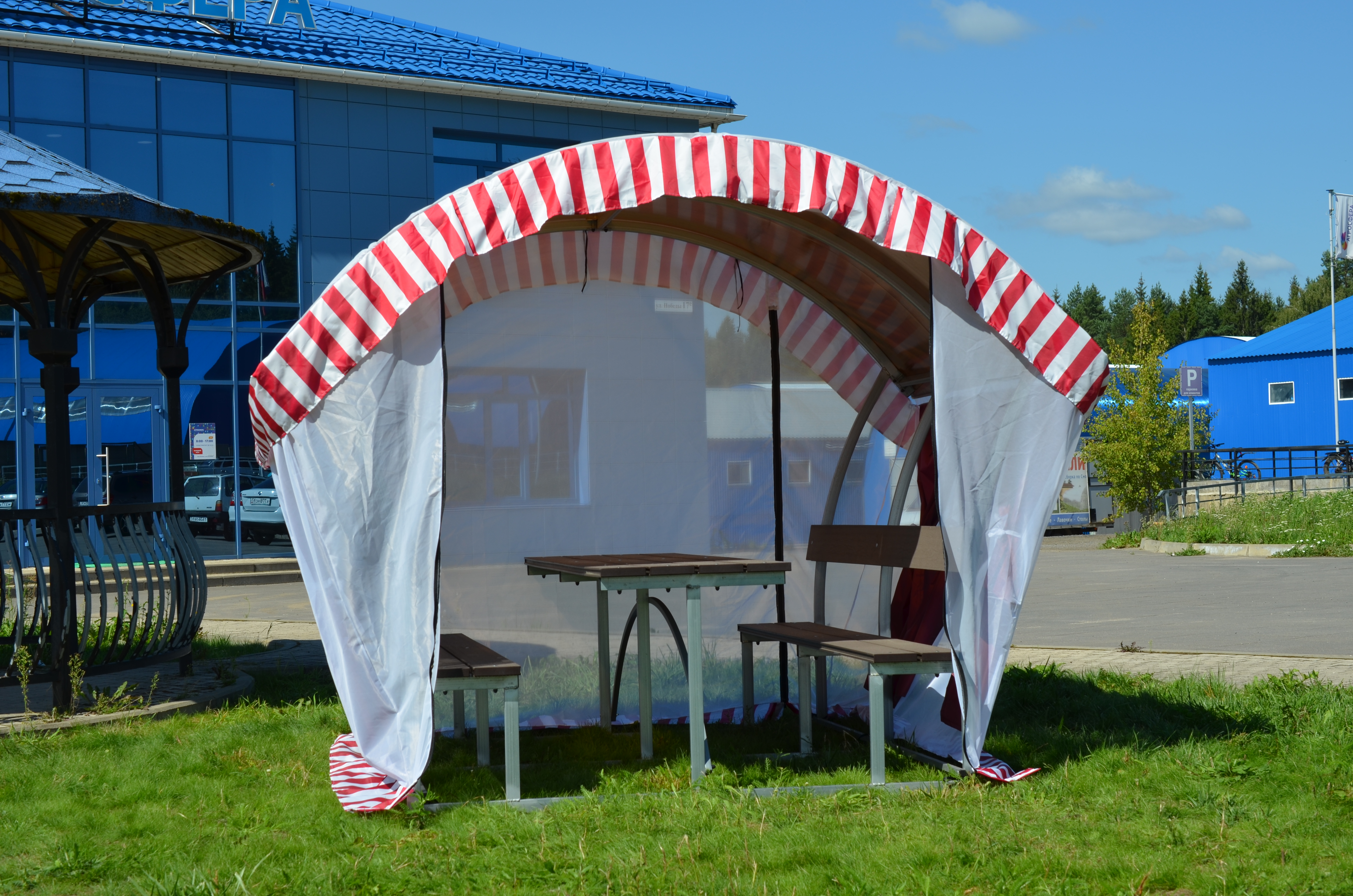 Устройство входных зон обеспечивает доступ с обоих торцов беседки и позволяет проветривать зону отдыха в жаркий день, в тоже время придавая ей легкое рассеянное затенение.