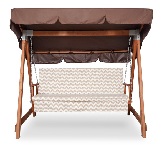 Это цветной матрас, предназначенный для садовых качелей, на него нанесён принт зигзага. Изготовлен данный матрас из европейской ткани с тефлоновым покрытием, в качестве наполнителя используется холлофайбер. Длина изделия составляет 155 см, толщина 5 см, глубина сидения 49 см, а высота спинки 55 см.
