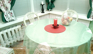 Посуда не оставляет на этой скатерти никаких следов. За счет того, что скатерть абсолютно прозрачная, она отлично будет смотреться в любом интерьере. Она подойдет для кухни, выполненной абсолютно в любом дизайне и в любой цветовой гамме. Скатерть подчеркнет текстуру стола, она сделает ее более глубокой. Ухаживать за такой скатертью очень легко, достаточно всего лишь иногда протирать ее влажной тряпочкой.